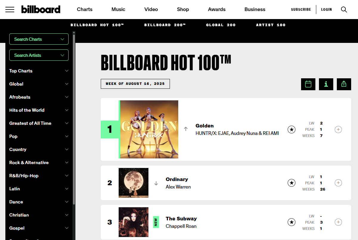 - Washington Post – KPop Demon Hunters' ‘Golden’ hits Billboard No.1