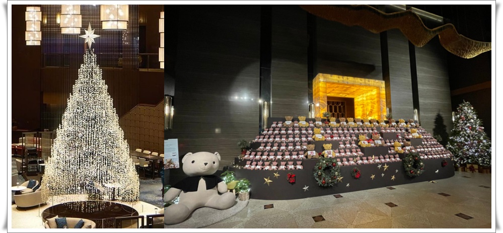 아차산에 위치한 워커힐 호텔은 크리스마스 및 연말을 맞이해 온 가족이 함께 크리스마스 분위기를 즐길 수 있도록 입구서부터 조명과 밝게 빛나는 트리를 설치했습니다. 워커힐 호텔 안으로 들어가면 로비에 큰 크리스마스트리가 있으며 베이커리 르파샤주 앞에 작고 귀여운 곰인형으로 장식된 트리가 있어 연인끼리 가족끼리 사진을 남길 수 있습니다.