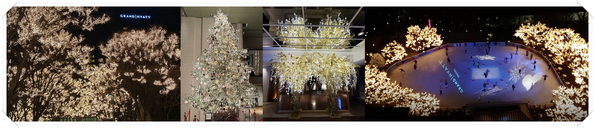 남산 이태원 쪽에 위치해 있는 그랜드 하얏트 서울은 호텔 입구에서부터 나무 위 수천 개의 전구들이 화려하게 반짝이며 연말 분위기를 장식하고 있습니다. 로비에는 단연 겨울 인증샷 최고로 손꼽히는 크리스마스트리가 장식되어 있습니다. 10m 높이의 크리스마스트리는 20년 이상 그랜드 하얏트 서울의 크리스마스트리를 장식해온 플로리스트 마기 린지만의 독특한 디자인이 녹아있습니다. 마기 린지는 1990년 이후 매년 겨울이면 그랜드 하얏트 서울을 찾아 직접 디자인하고 제작한 트리 장식용 오너먼트와 인테리어 소품으로 트리를 꾸미고 있습니다. 연인들의 대표 로맨틱 데이트 코스이자 어린이 동반 가족들의 겨울 호캉스 명소인 아이스링크 또한 빠질 수 없는 포토 존입니다. 은빛 얼음과 빛나는 불빛, 그리고 서울의 야경을 배경으로 사진을 찍는다면 잊을 수 없는 인생샷을 건질 수 있습니다.