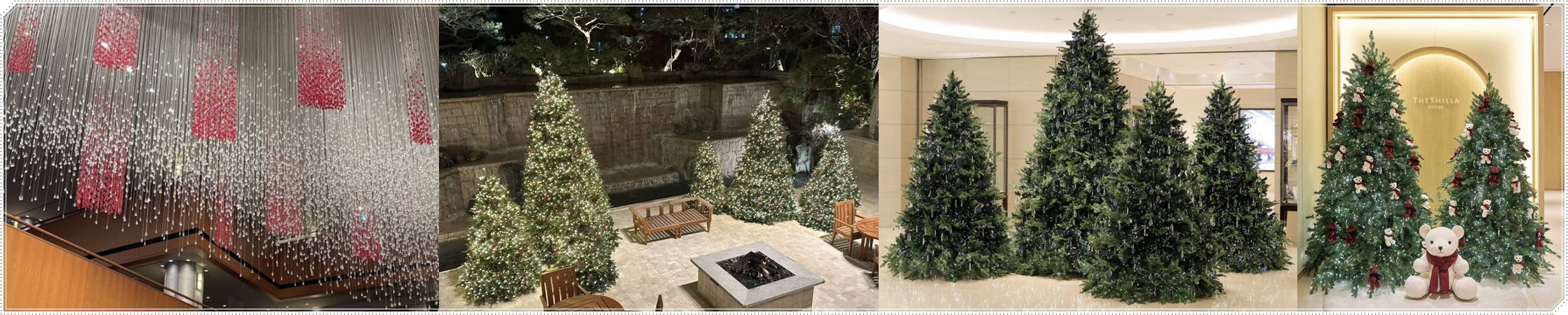 장충동에 위치한 서울 신라호텔 로비에는 크리스마스트리 대신 평소 투명한 비즈로 밤하늘의 은하수처럼 반짝이던 박선기 작가의 설치 작품 '조합체 An Aggregation 130121'에 레드 컬러 비즈를 추가해 크리스마스 무드를 연출하였습니다. 그리고 크리스마스트리는 지하 1층 아케이드, 더 파크뷰, 영빈관과 키즈라운지에서 만날 수 있습니다. 아케이드 광장에는 반짝이는 아크릴 비즈와 조명으로 연출한 신라호텔만의 고급스럽고 우아한 크리스마스트리가 고객을 기다리고 있으며 더 파크뷰 테라스도 다양한 크기의 크리스마스트리로 장식되어 있어 연말의 설레는 분위기를 한층 돋우고 있습니다. 고즈넉한 영빈관 분위기와 은은한 달빛이 어우러진 영빈관 후정의 반짝이는 크리스마스트리는 서울 신라호텔만의 독특한 연말 분위기를 자아내고 있습니다. 올해 새롭게 선보인 키즈 라운지에도 크리스마스트리를 설치했습니다. 기존에 커다란 신라 베어가 놓여있던 포토존에 레드와 화이트의 작은 신라 베어를 오너먼트로 장식한 크리스마스트리 2개가 자리를 잡고 있습니다. 트리 앞에는 머플러를 두른 귀여운 신라 베어가 놓여 있어 인형을 안고 특별한 추억을 사진으로 남길 수 있게 하였습니다.