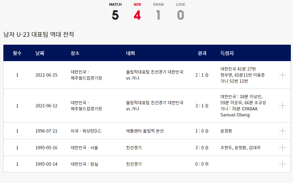 U-23 남자 축구대표팀의 가나와의 역대 전적은 5전 4승 1 무 무패로 우세합니다. 최근 2021년 6월에 열린 올림픽대표팀 친선경기에서 2경기 모두 승리하였습니다.