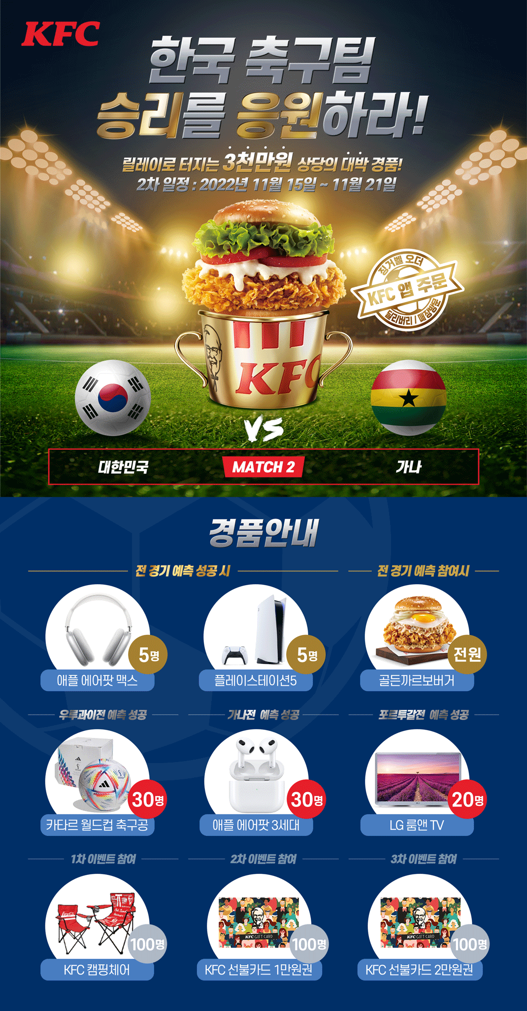 KFC는 대한민국 축구팀의 선전을 기원하는 의미에서 '승무패를 예측하라! 릴레이 이벤트'를 준비했습니다. 우루과이와의 경기 결과를 맞혀 예상되는 경기 결과에 따라 승리 팩, 무승부 팩, 패배 팩 메뉴를 선택하고 예측에 성공한 고객 중 추첨을 통해 카타르 월드컵 공인 축구공(30명)을 선물로 증정합니다. 또한 구매에 참여만 해도 추첨을 통해 KFC 캠핑체어(100명)를 선물로 제공할 예정이라고 합니다.