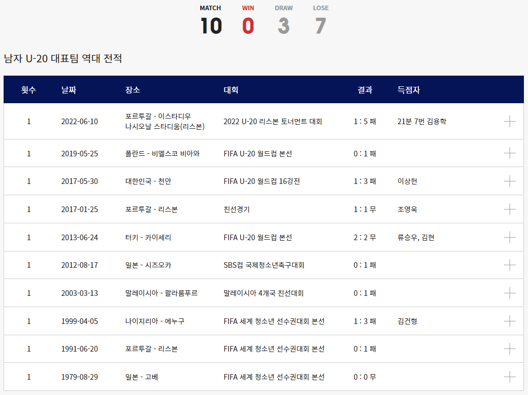 전적만 보면 2002년 한일월드컵을 제외하고 만 20세, 만 17세 이하 축구대표팀과의 경기 모두 절대적 열세에 있습니다. 아직까지 포르투갈은 한국보다 우위에 있는 강팀입니다.