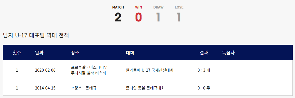 만 17세 이하 축구대표팀은 2경기를 치렀습니다. 전적은 2전 1무 1패로 열세에 있습니다.