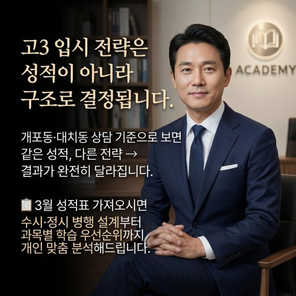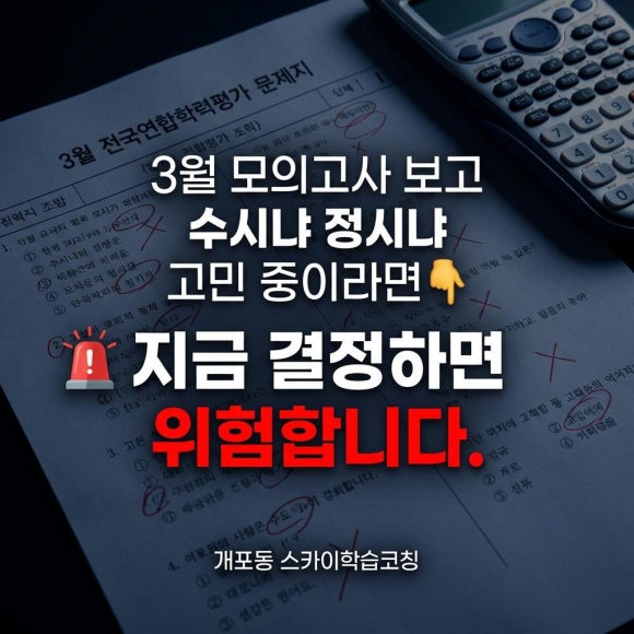 개포동·대치동 인근에서 고3 입시 전략 상담을 원하신다면, 스카이학습코칭으로 문의해 주세요. 3월 성적표를 가져오시면 수시·정시 병행 설계부터 과목별 학습 우선순위까지 개인 맞춤으로 분석해 드립니다.