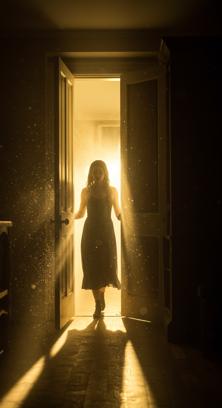 바로 그 순간이었습니다. 촬영장의 뒷문이 조용히 열리며, 한 여성이 들어왔습니다.